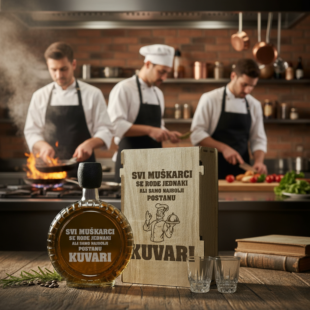 Elegantan i praktičan poklon za slavu! Uključuje kutiju dimenzije 23x15x5cm, izrađenu od najkvalitetnijeg lesonita u boji drveta, izgraviranu flašu za rakiju od 0,5l, ručno izrađen drveni čep i dve čašice (rakija nije uključena).