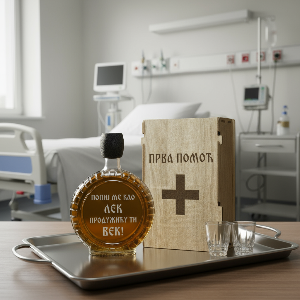 Tradicionalna srpska čutura zapremine 0,5 litara, sa pažljivo ugraviranom posvetom direktno u staklu. Gravura se savršeno uklapa sa dizajnom kutije i ostaje trajno, bez straha od habanja.
