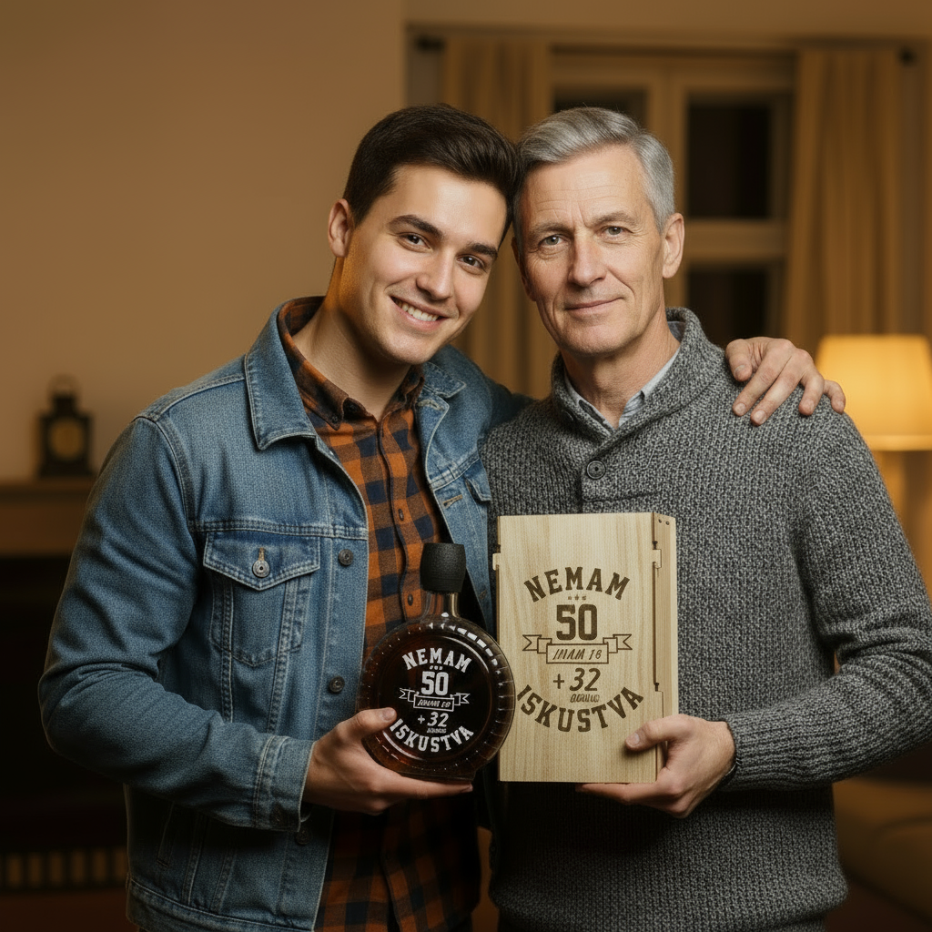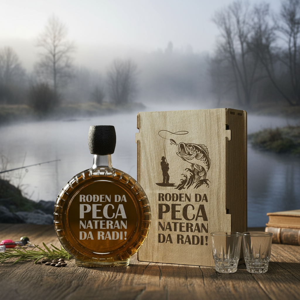 Tradicionalna srpska čutura zapremine 0,5 litara, sa pažljivo ugraviranom posvetom direktno u staklu. Gravura se savršeno uklapa sa dizajnom kutije i ostaje trajno, bez straha od habanja.