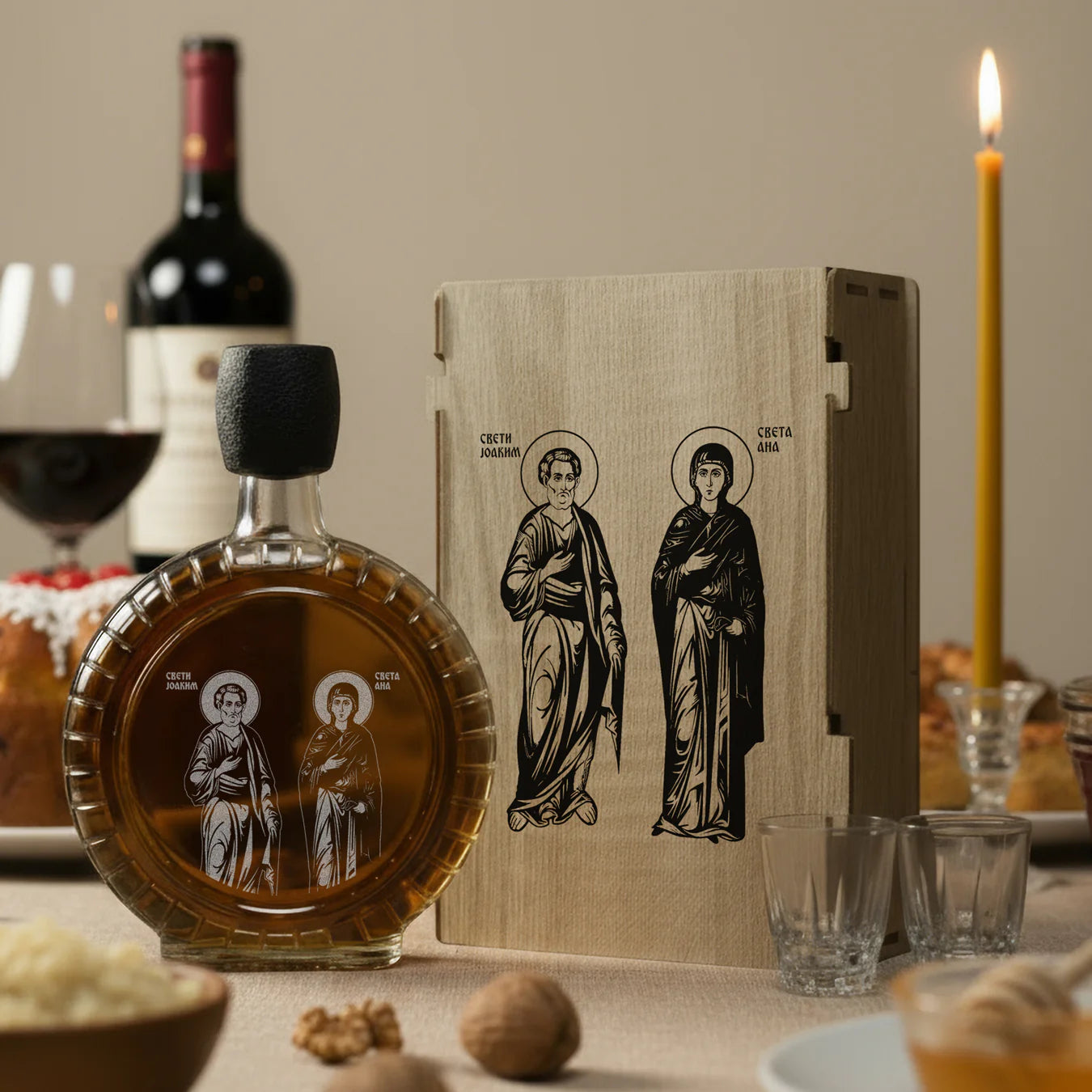 Slavski poklon set Sveti Joakim i Ana, sa 2 čašice (rakija nije uključena)