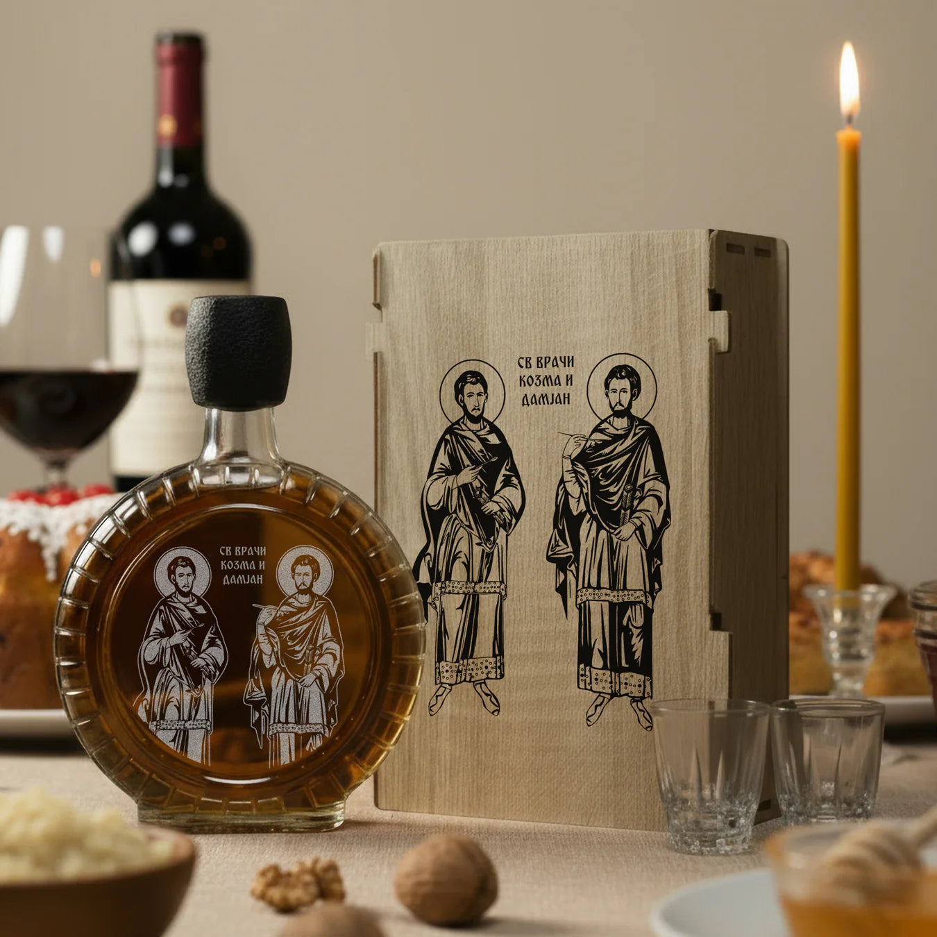 Slavski poklon set Sveti Kozma i Damjan - Vračevi, sa 2 čašice (rakija nije uključena)