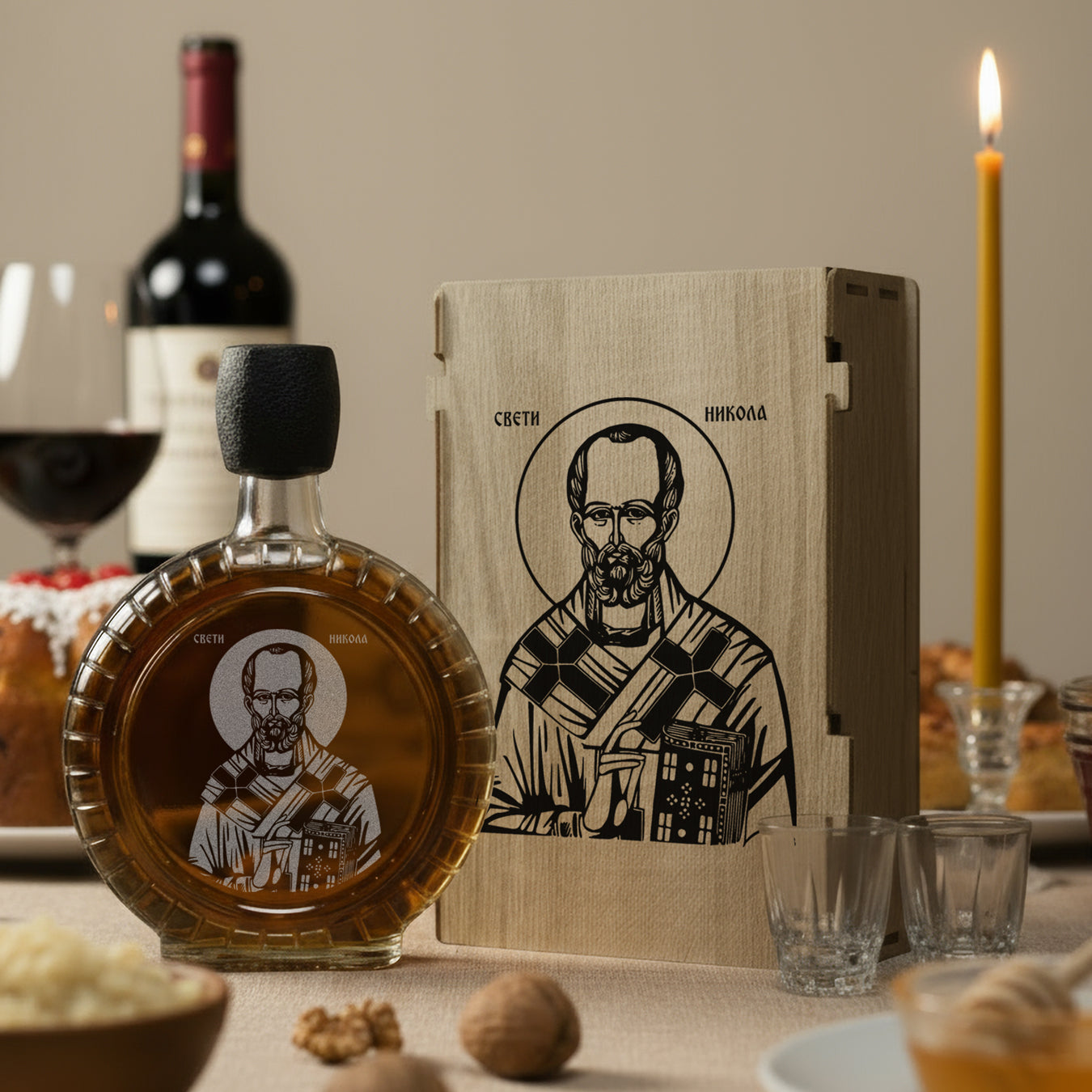 Slavski poklon set Sveti Nikola - Nikoljdan, sa 2 čašice (rakija nije uključena)